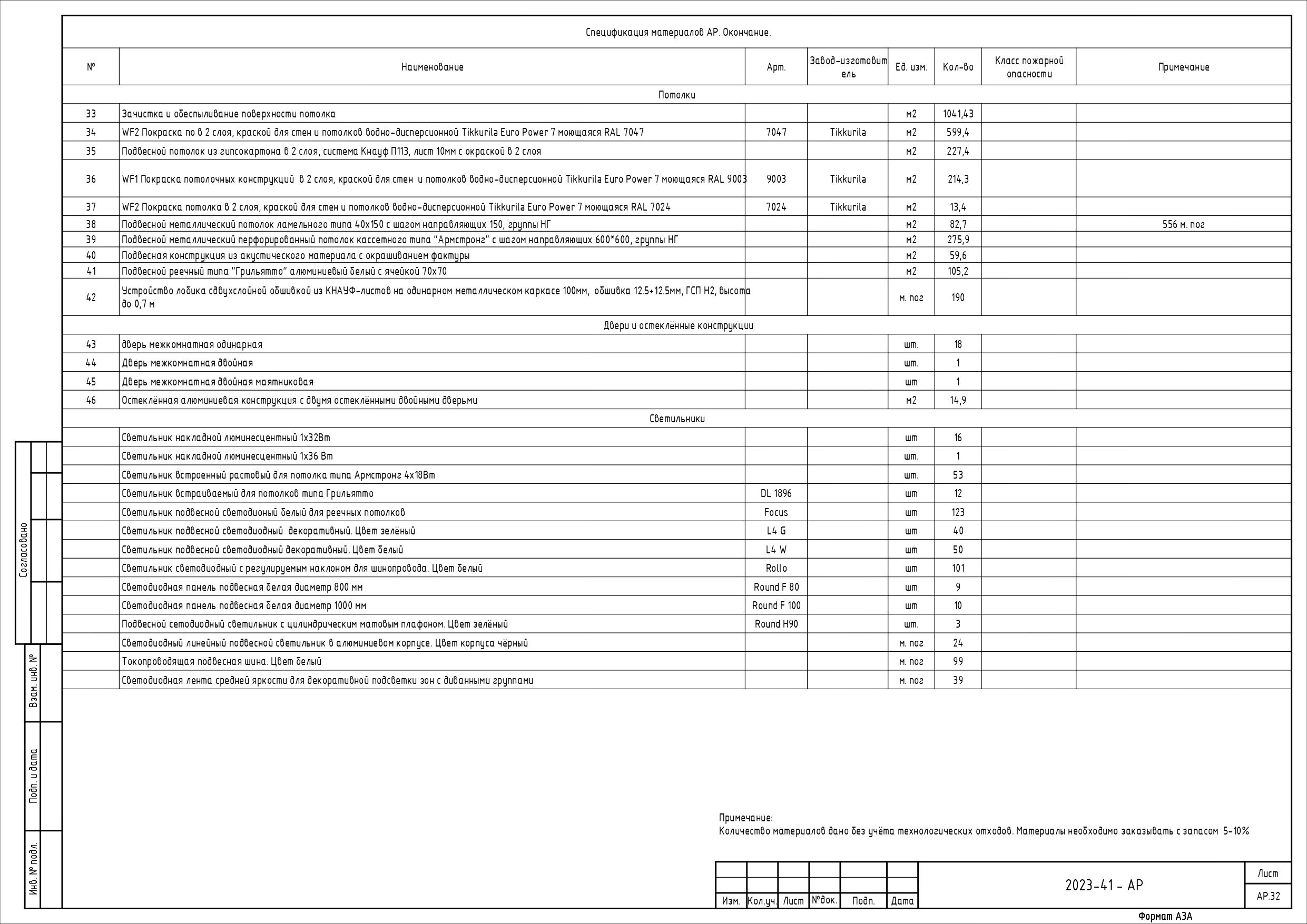 Каркасы и заполнение подвесных потолков на путях эвакуации выполняются из негорючих материалов или подвесных потолков на путях эвакуации выполняются из негорючих материалов или материалов группы горючести Г1, а отделка стен и потолков помещений предусматривается из трудно горючих или негорючих материалов. В отделке помещений и путей эвакуации используются отделочные материалы, имеющие сертификаты пожарной безопасности или протоколы испытаний на горючесть, воспламеняемость, токсичность и дымообразующую способность зарегистрированных в России лабораторий (испытательных центров).