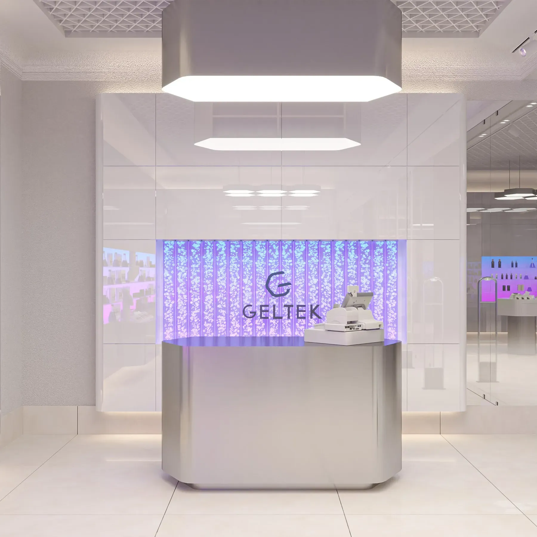 The aim of this project was to create a modern concept space for the Geltek professional cosmetics store, designed specifically for placement within a shopping mall.