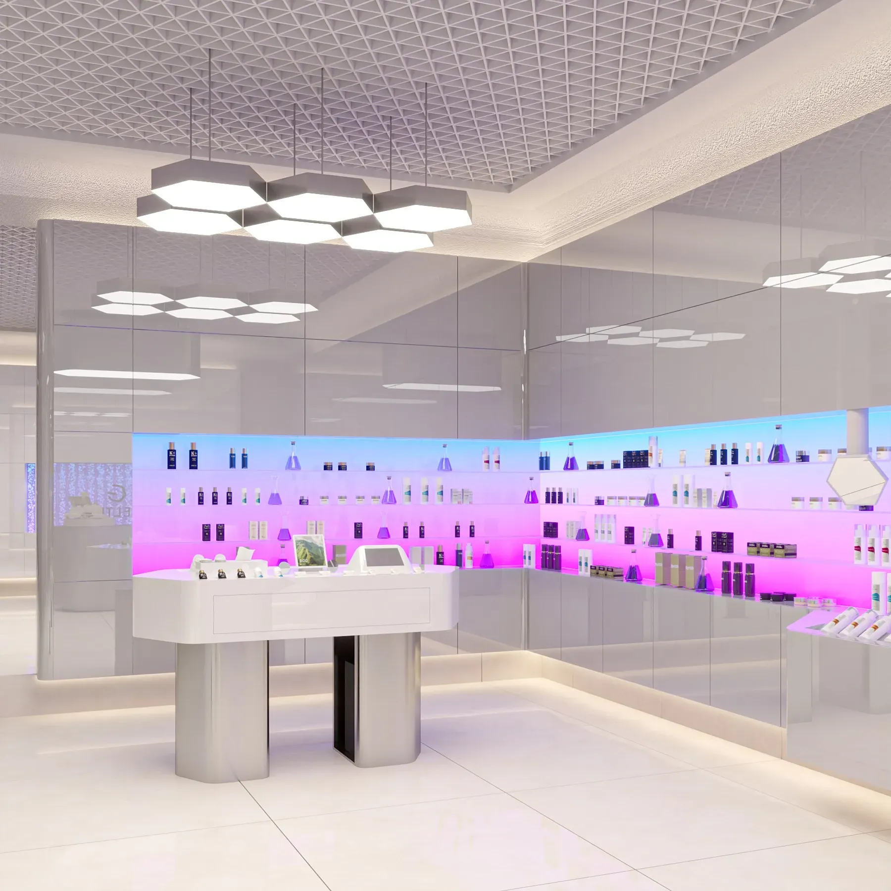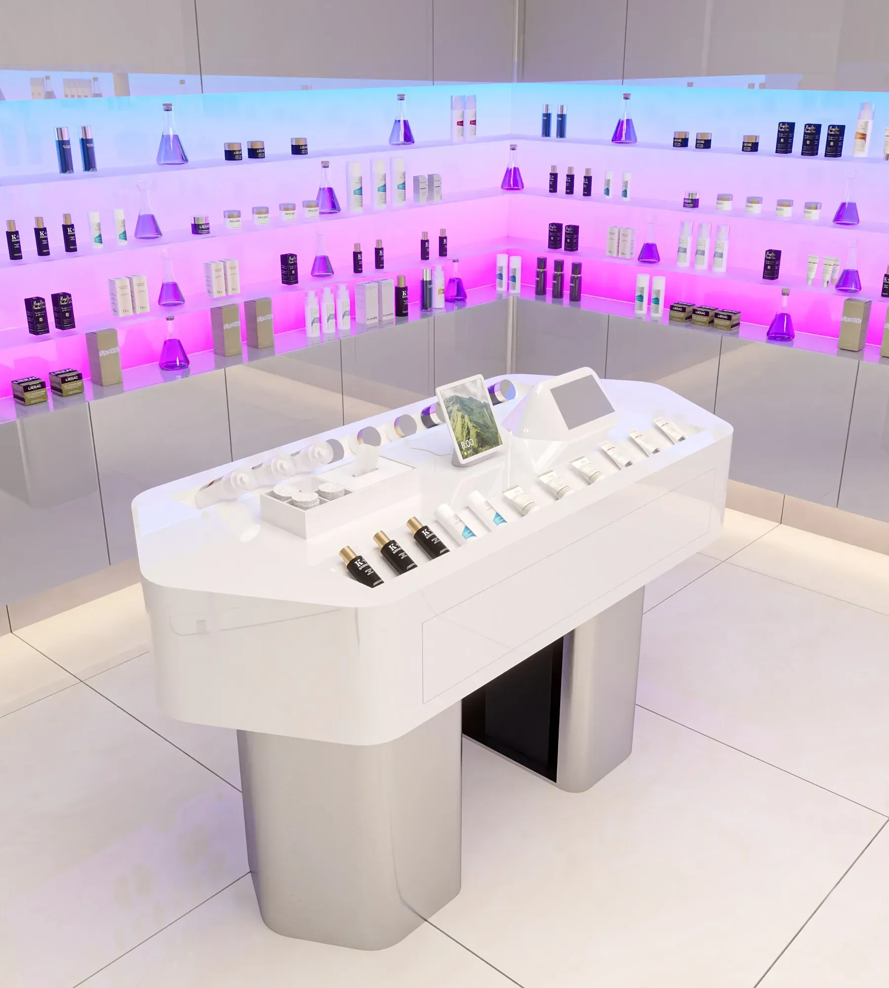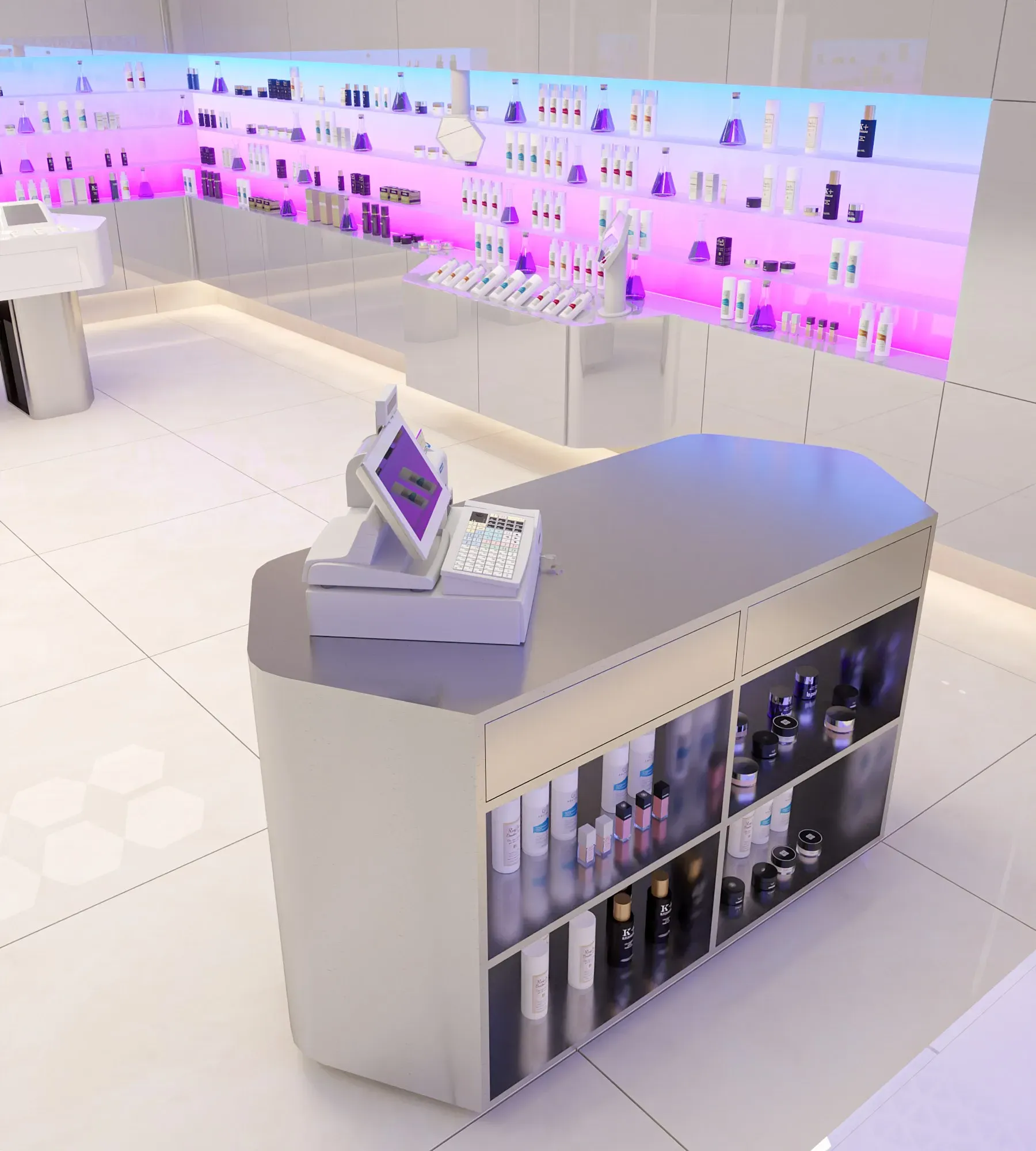 To achieve this, we incorporated flowing lines into the furniture to add a sense of softness and futurism. Metallic accents were used to evoke the image of a spaceship. A bold, nearly neon gradient strip serves both to reinforce the cosmic theme and to draw attention to the cosmetics displayed in front of it.
