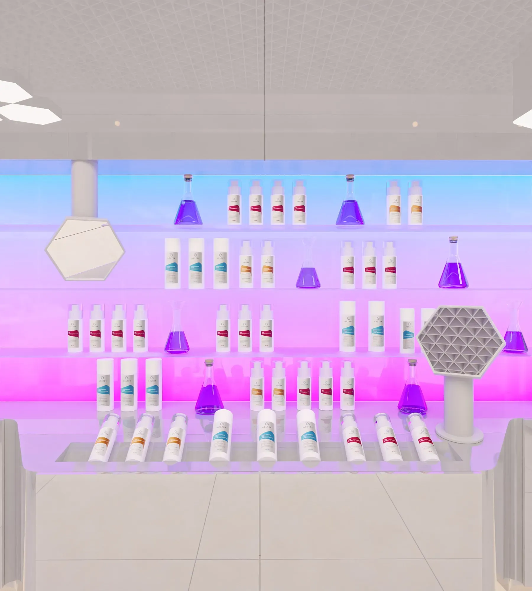 We began by searching for shapes and forms that would reflect the idea of a perfect cosmetology lab in space. This led to the creation of a concept design for the store that integrates digital technologies and futuristic aesthetics.