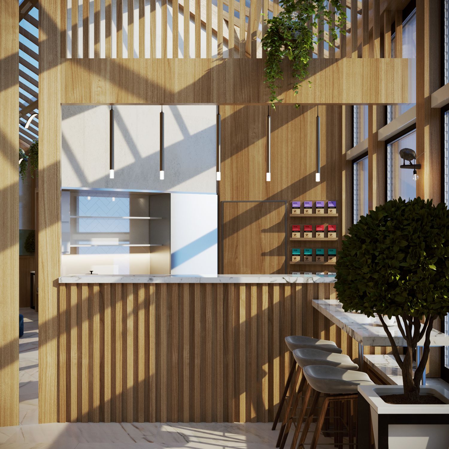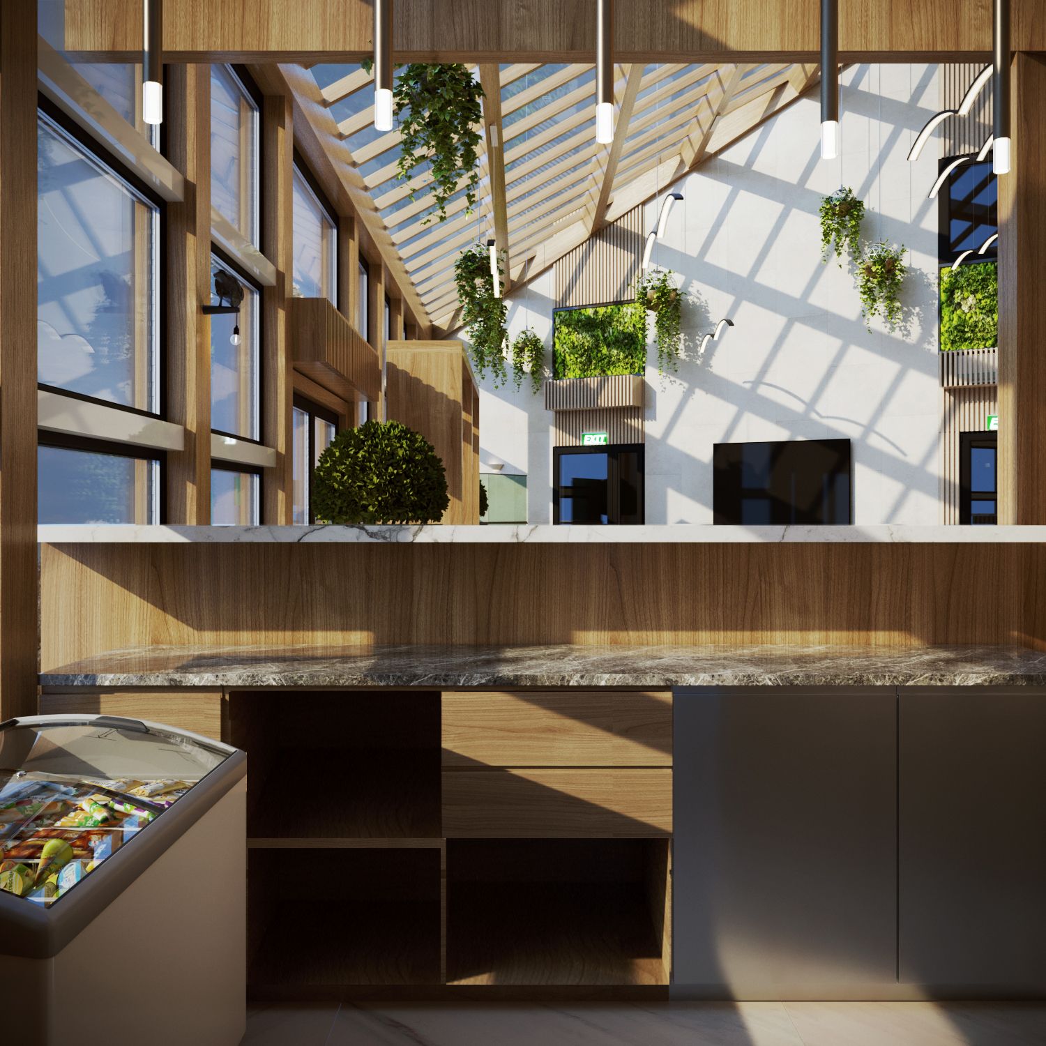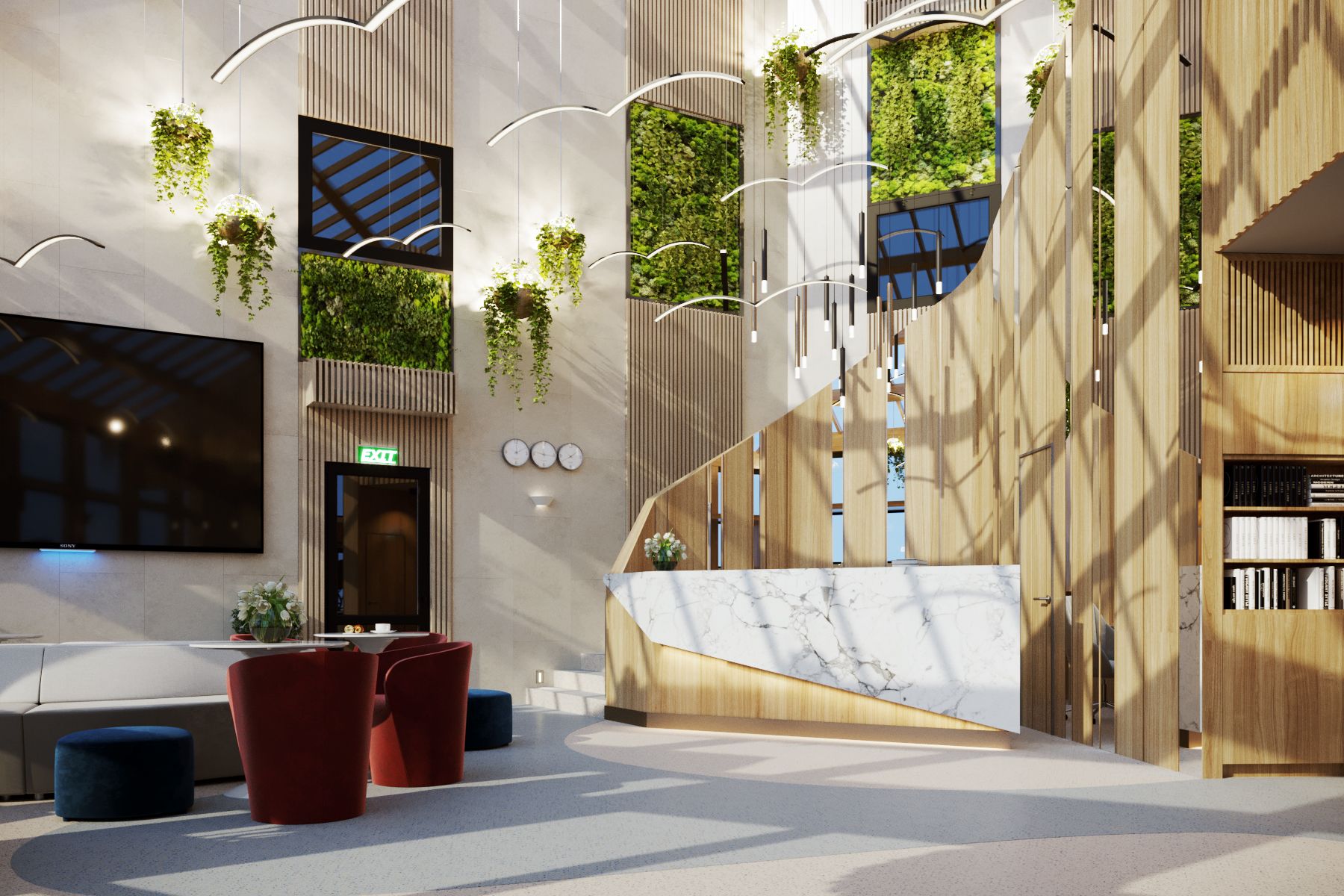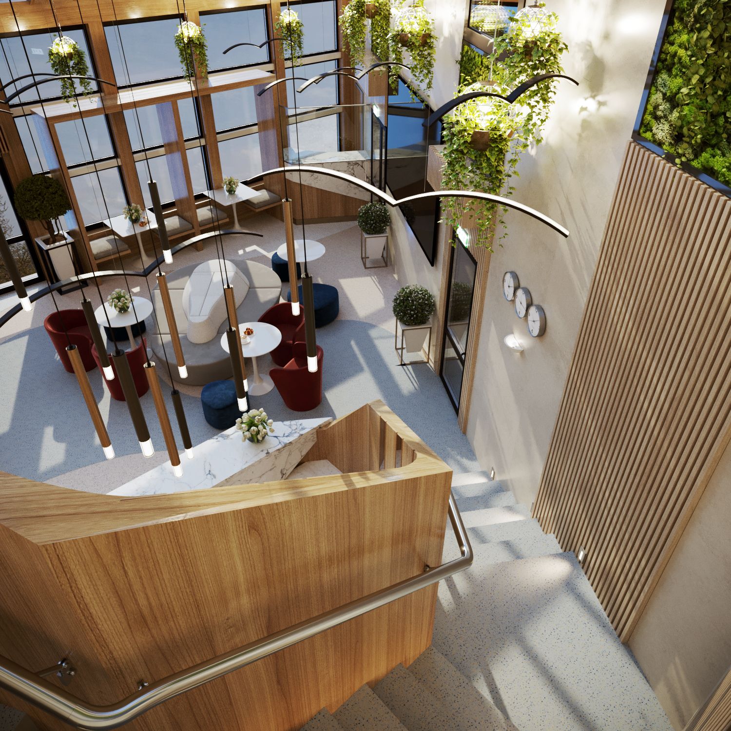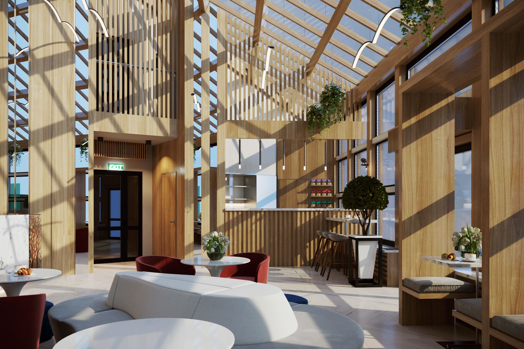 Пространство лобби зажато между двух жилых корпусов отеля, имеет треугольную форму и светопрозрачные конструкции потолка и стен. В лобби напротив входа размещена рецепция отеля с местом работы для администратора, под лестницей выделено меесто отдыха администратора, справа от входа расположилось кафе с небольшой доготовочной, а слева место работы ночного сторожа.